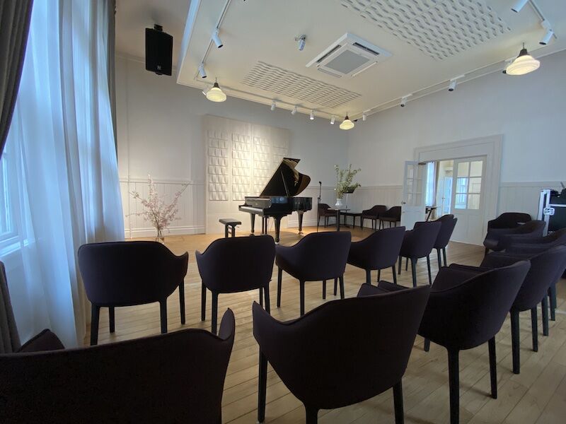 フレンチレストランのボン・ヴィヴァンさんのスペースの一部とギャラリーとして使われていた神楽サロンの一部を改修して作られたホールです。建物は、旧山田郵便局電話分室として1923年に建てられ、国の登録有形文化財に指定されているそうです。